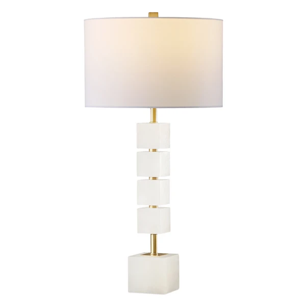 Featuring four handmade white alabaster blocks wrapped around a gold metal post, this statuesque table lamp rests atop a white cube base and makes a decadently dramatic statement in any room.