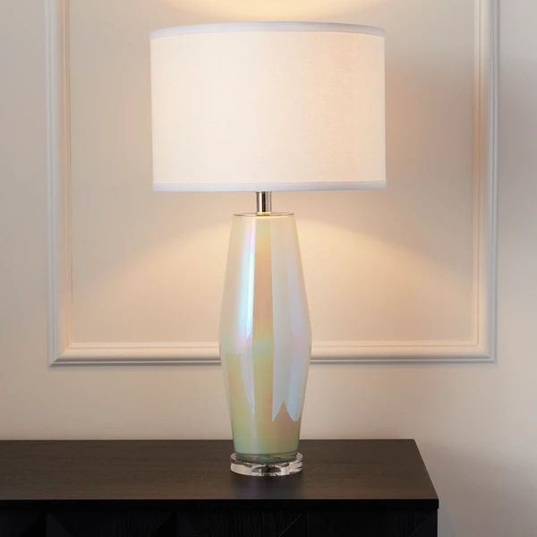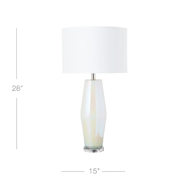 A glamorous addition to any interior, this table lamp is crafted of glass with a shapely silhouette and beautiful iridescent finish. A clear acrylic base and white linen drum shade complete the look.