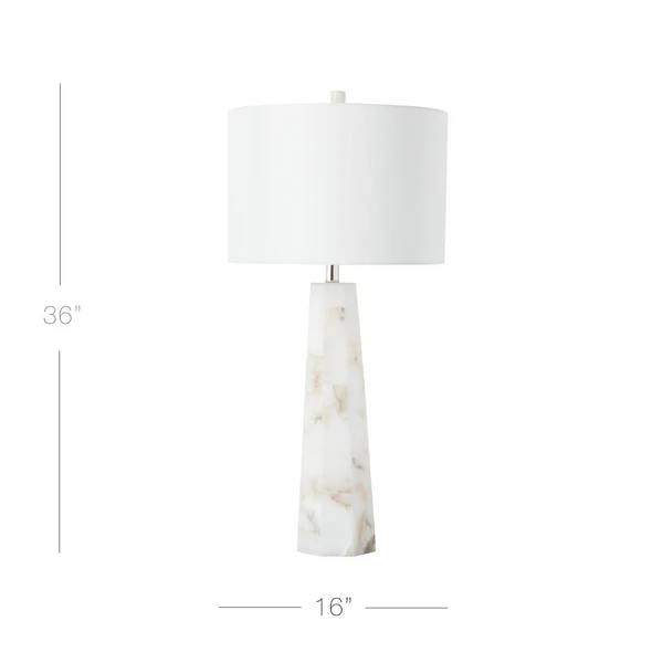 A genuine Alabaster base with a tapered silhouette is the calling card of the Aurora Table Lamp. This stone lamp is French-wired to preserve the inner glow and artful nature of this unique mineral. Topped with a Linen roll-edge shade and matching alabaster cylinder finial for a finished look from top to bottom.