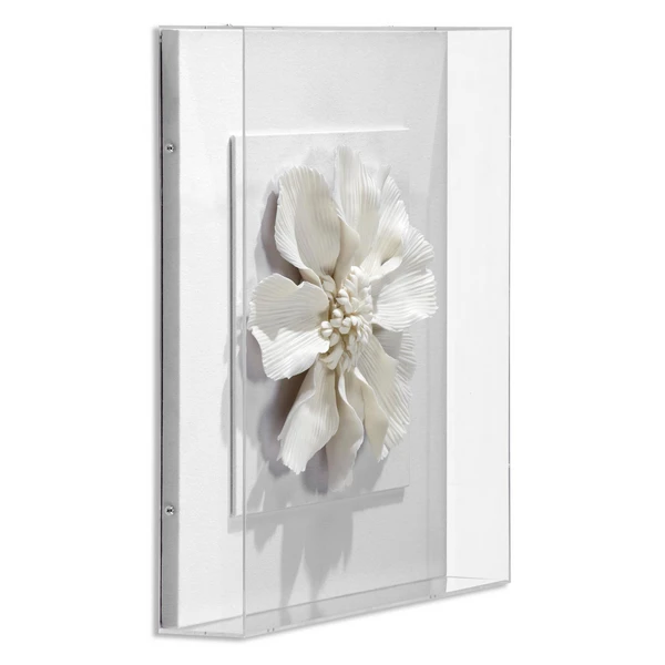 - Flower sculpture on linen backing set in an acrylic shadowbox.