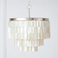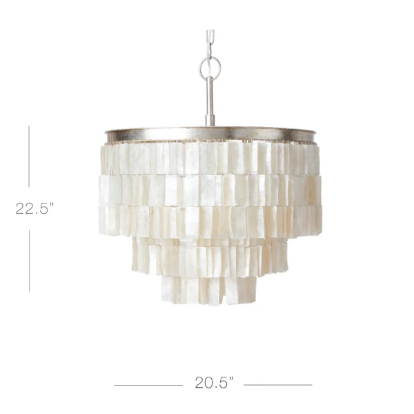 The light-catching iridescence of our exclusive Capiz Chandelier will draw attention even when the lights are off. 3 tiers of more than six-hundred Capiz shells cascade from an iron frame, emitting a warm glow of diffused light.
