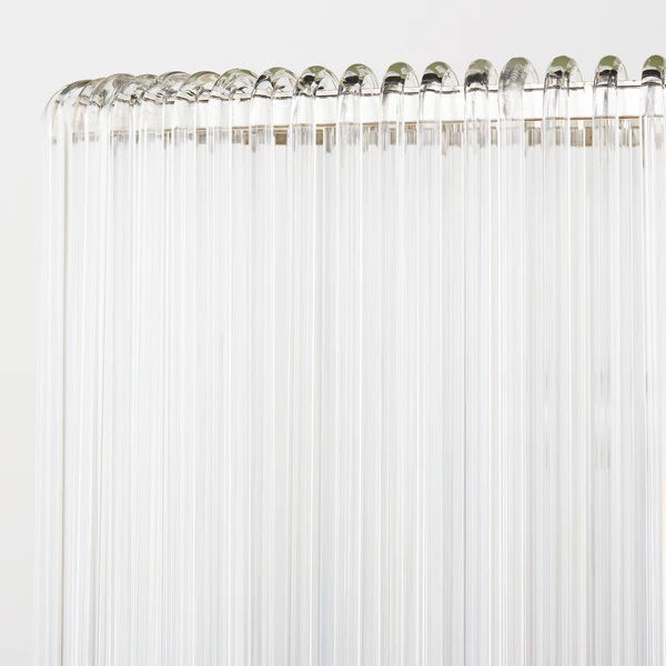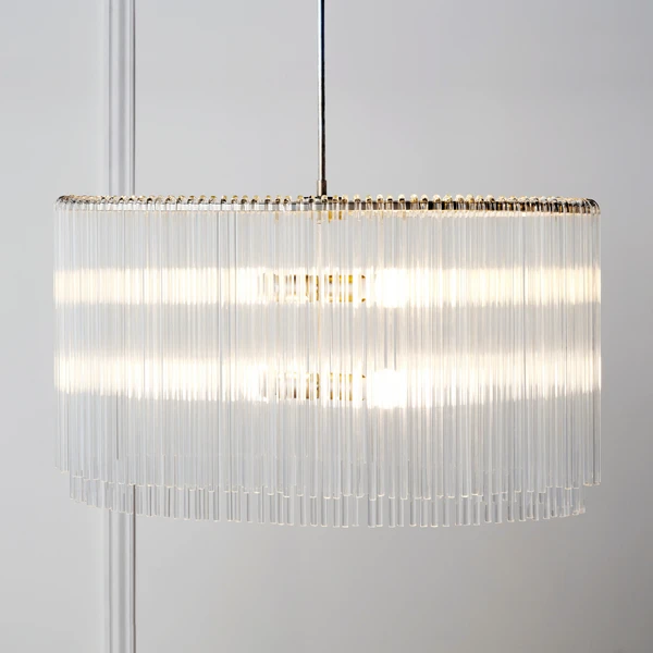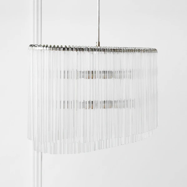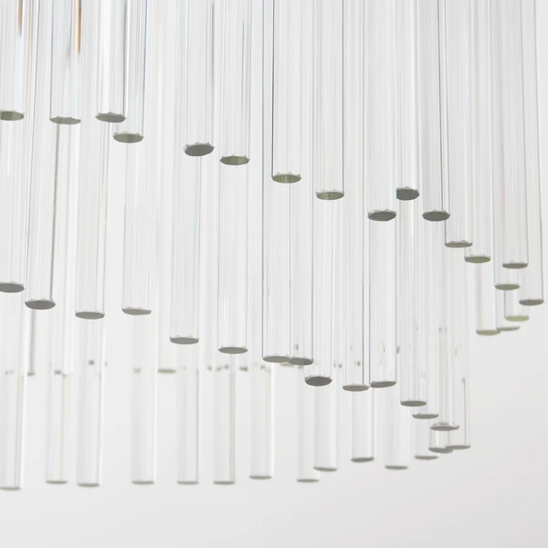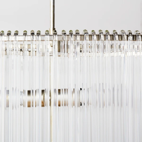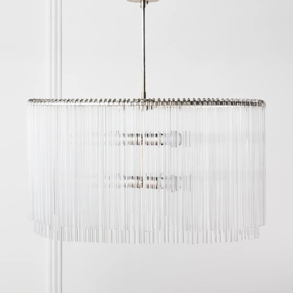 Our exclusive linear glass Cascada Chandelier is the perfect balance of clean design and shimmering charm. More than 100-pieces of hand-bent glass are draped over Cascadaâs champagne leaf-finished frame, for a layered effect that will be the talking point of your room.