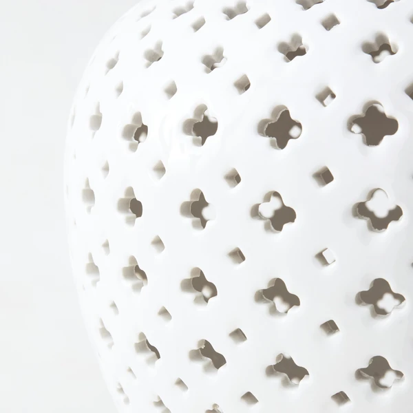 Hand-carved cutouts on the surface of this ceramic ginger jar form an intricate filigree motif, adding impressive character and texture to any surface. Because this item is handmade, variations in size and shape may occur. Available in Glossy White and Champagne finishes.