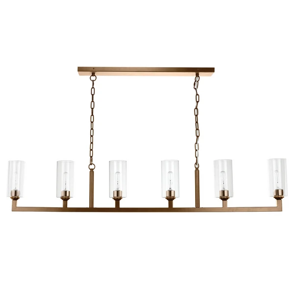 The stylish angles of the chandelier provide a warm illumination that highlights any bar, counter or dining room elegantly. This hanging fixture modernizes the classic vintage torchier with clear glass shades and metallic chain link hardware.