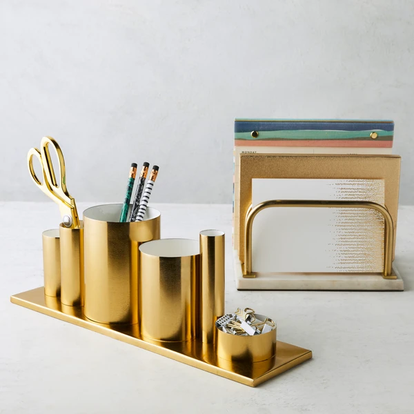 A chic and modern addition to the home office, this collection of gold-finished desk accessories will keep you organized in style