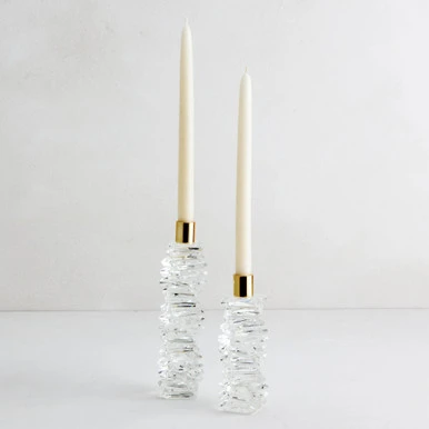 Spark illuminating conversation by candelight with this eye-catching column of offset crystals supporting an elegant gold taper holder. Group together small and large tapers to create an eclectic candelabra effect. Sold separately.