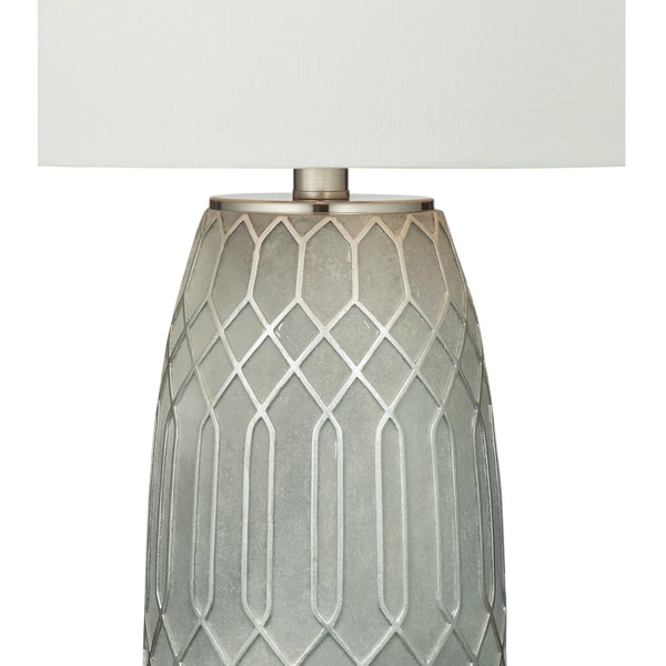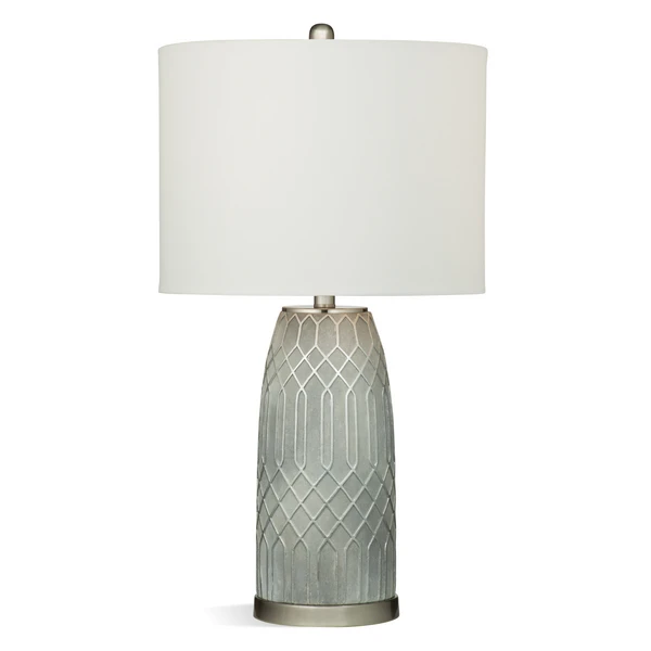 The Ellery Table Lamp is crafted of Resin in a Cement with Silver Leaf and Brass finish with a white linen lined drum shade.