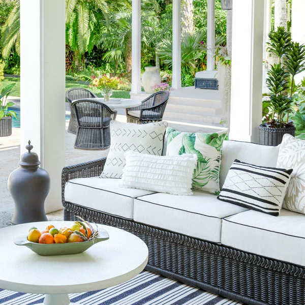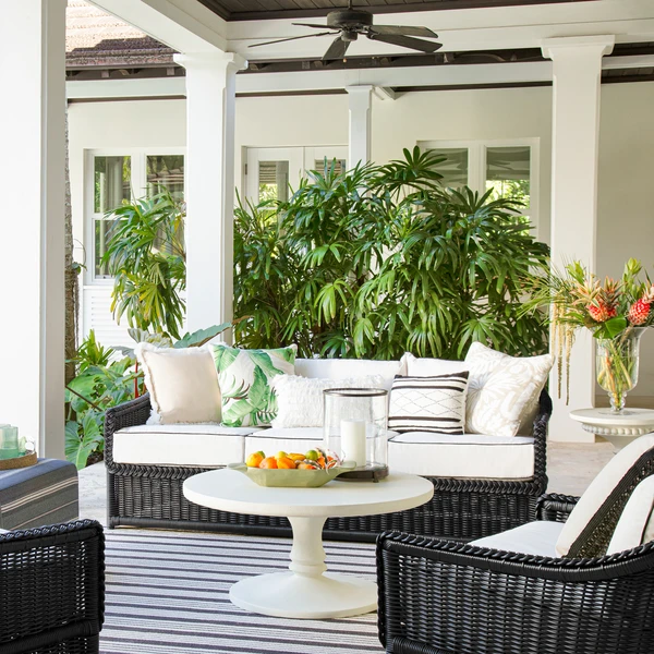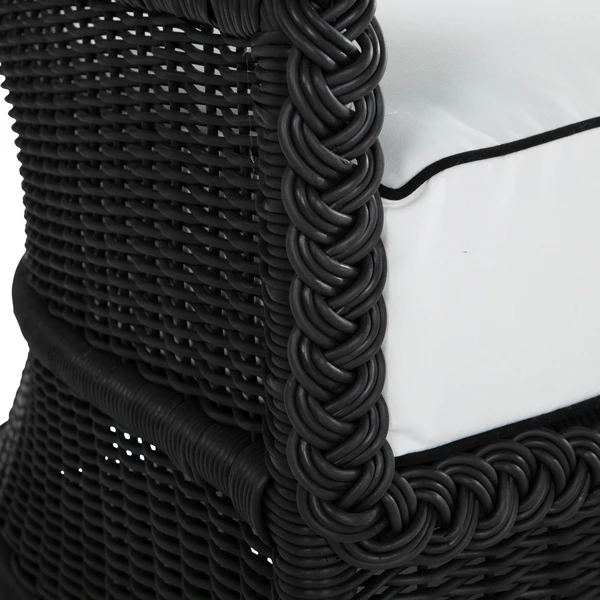 The intricate braid detailing is just one feature that makes this outdoor chair a standout. The chair is blissfully comfortable too, thanks to its generous proportions and the plush high-density fill of the cushions. N-dura resin wicker, which looks like rattan but is UV-resistant and impressively durable, is handwoven over equally long-lasting aluminum. The cushions are covered in stain-resistant, mold-resistant, fade-resistant fabric; the black trim adds tailored finesse.