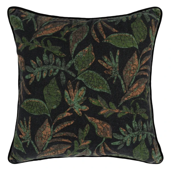 Deep, lush greens pop against the black background of our striking Emmy pillow, creating a look that hints of drama. Digitally printed with a leaf design, Emmy is a timeless design.