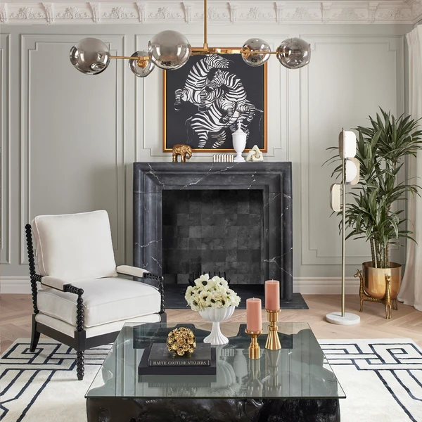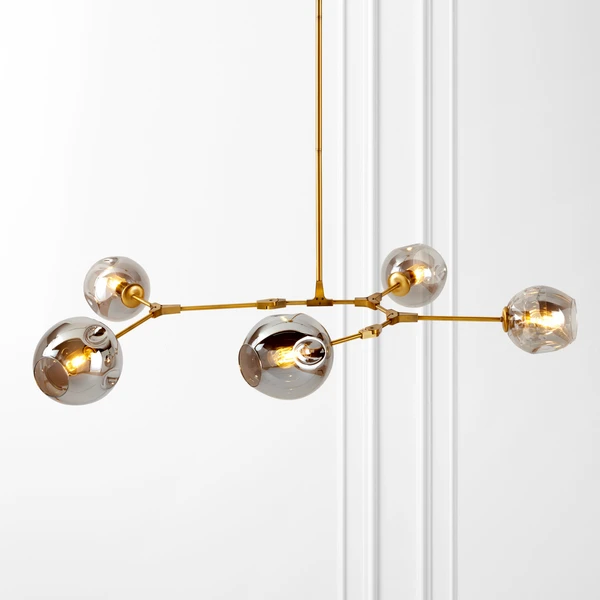 Bold yet refined, this midcentury-inspired chandelier elevates any space with its brass finish and smoky glass shades.