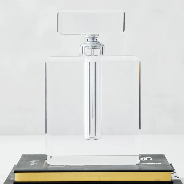 For those who love living large, our outstanding 10.5 inch tall Harlow perfume bottle is a dressing table essential. Crafted of clear, solid glass with simple beveled edges, the Harlow bottle has a removable stopper with an attached long glass stem and Silver metal fittings at the opening.