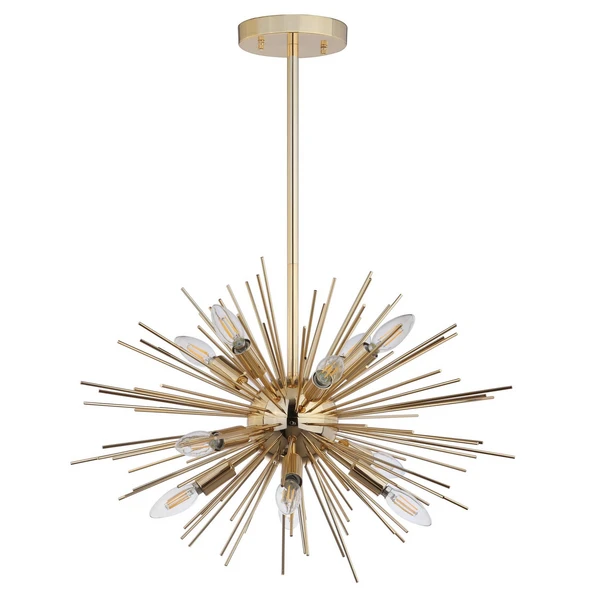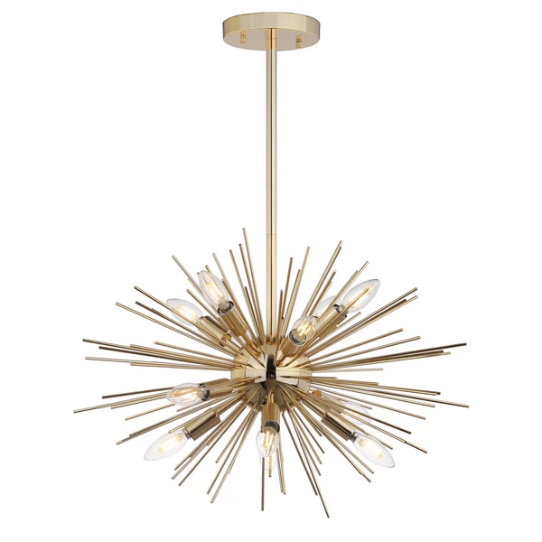 A modern take on a classic Sputnik-style fixture, this pendant showcases a sunburst of gold-finished rods and exposed bulbs stemming from a central orb.