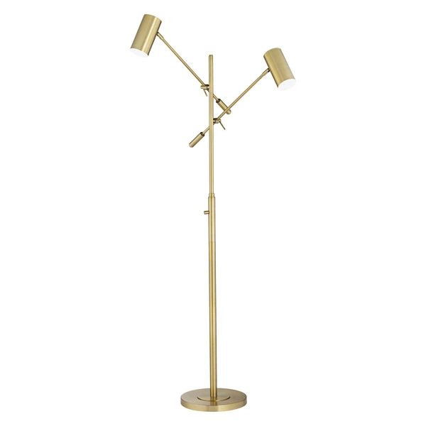 An adustable double artticulating flloor lamp that features warm brass finish with cylinder metal shades.
