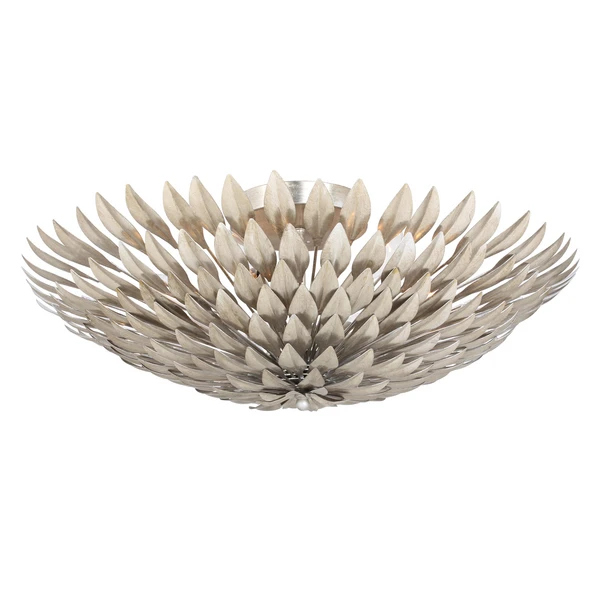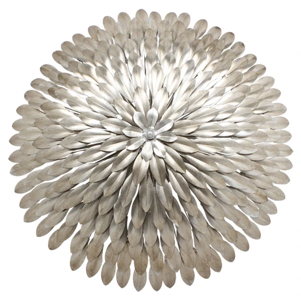 Inspired from elements found in nature, our Laurel Flush Mount brings organic layers and sophisticated illuminating décor to a space. Hand applied wrought iron leaves gracefully form the circular dome shape of this ceiling mount sconce. A vibrant finish of antique silver details each applied leaf, casting a stunning glow and making the Laurel Sconce a decoratively distinct piece to grace your space.