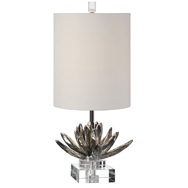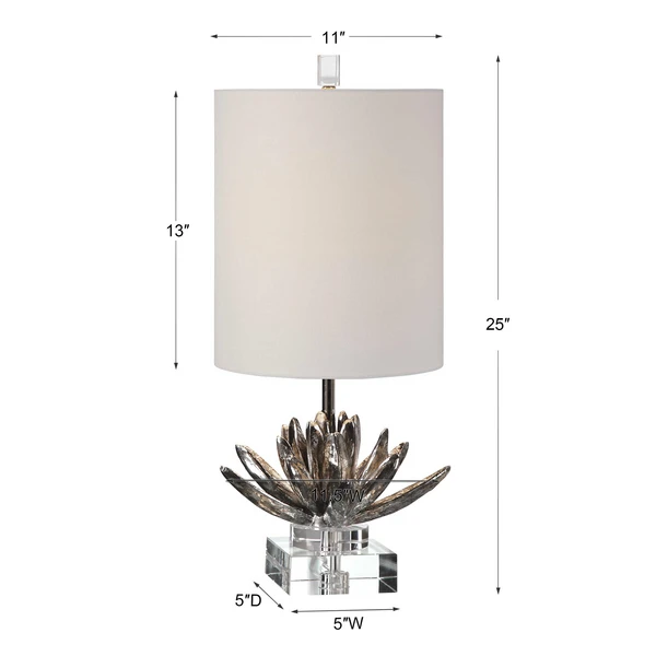 Simple elegance is achieved by this antiqued, metallic silver, lotus bloom that appears to be floating on a clear crystal foot. The round hardback drum shade is a white linen fabric with natural slubbing.