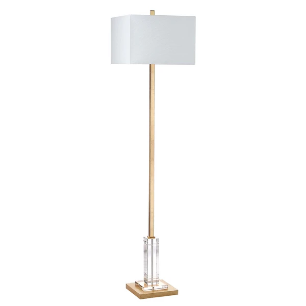 Designed with an elegant simplicity, this floor lamp is crafted with a clear crystal base and antiqued gold finish. A boxy cream shade completes the look.
