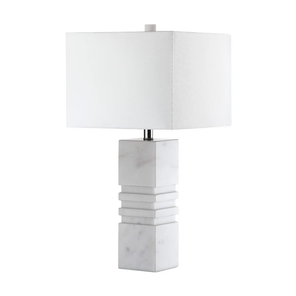Inspired by the dramatic angles of modern sculpture, this white marble table lamp is a design must. Its clean lines and crisp off-white shade bring timeless style to room.