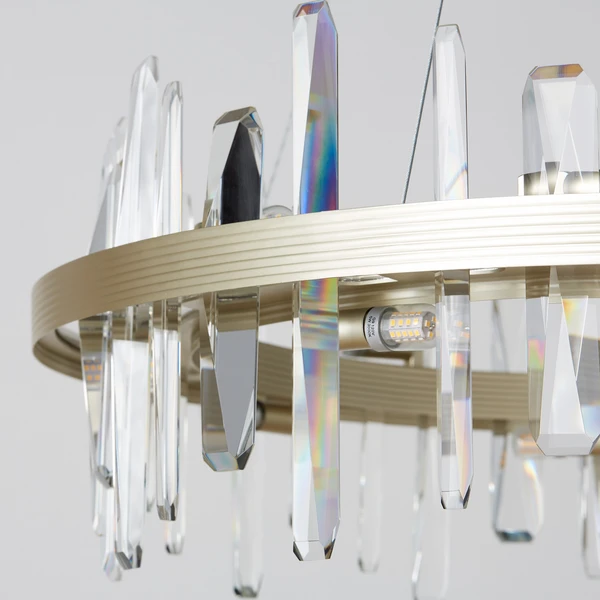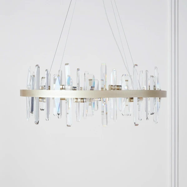 Invite a dancing display of light to any space with our deco-inspired Lumi Chandelier, featuring artfully beveled glass daggers extending above and below an iron frame.