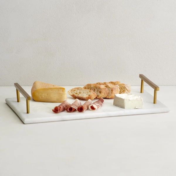 Our marble cheese tray adds sophistication to any hors d’oeuvre presentation with a contrasting combo of natural stone transported by gold stainless steel handles.