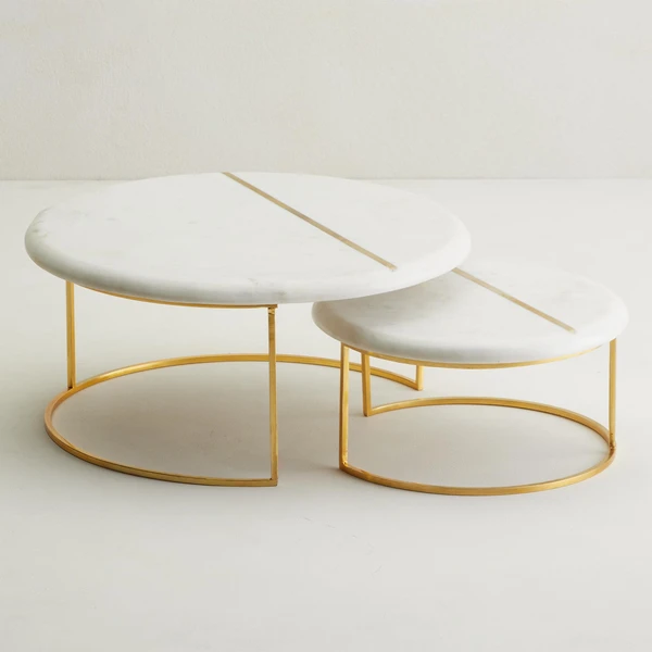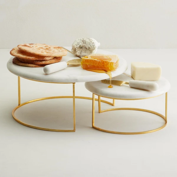 Elevate your dinner party presentation with our sophisticated marble nesting trays. A curved gold stainless steel base supports each round tray, offset with gold inlay for an unexpected finishing touch.