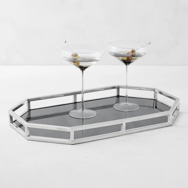 Sleek and contemporary, our Metropolitan Tray offers a hexagonal shape with modern appeal and high style to arrange your libations on. The tray’s ample surface is lined with black glass and a sturdy stainless steel rim runs along the perimeter, making it effortless to wait on your guests with style.