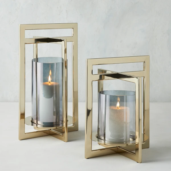 A sleek and modern addition to any space. This gleaming gold lantern features a silvered glass vessel, encased in an interlocking framework.