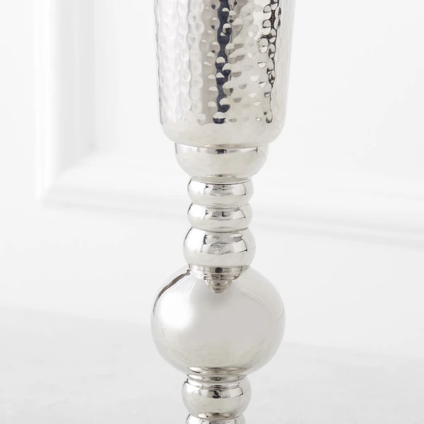 Featuring a hammered silver finish, this sculptural vase makes a stylish statement on the shelf.