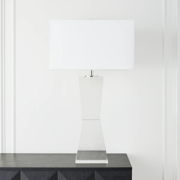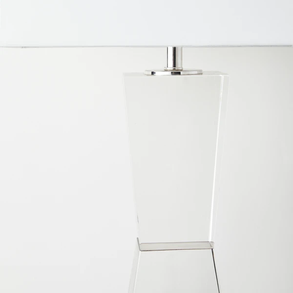 Classic and refined, this table lamp is crafted of clear crystal with a cynched base that beautifully reflects the light. A white drum shade accented with nickel hardware to complete the look.
