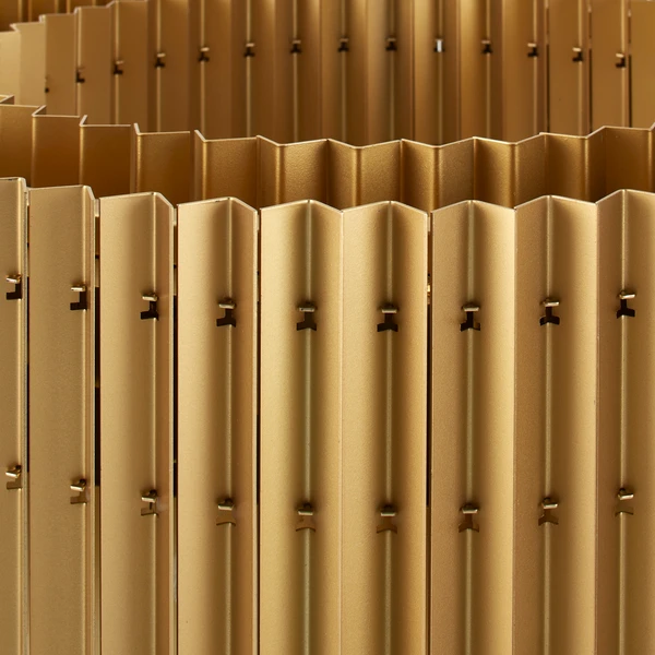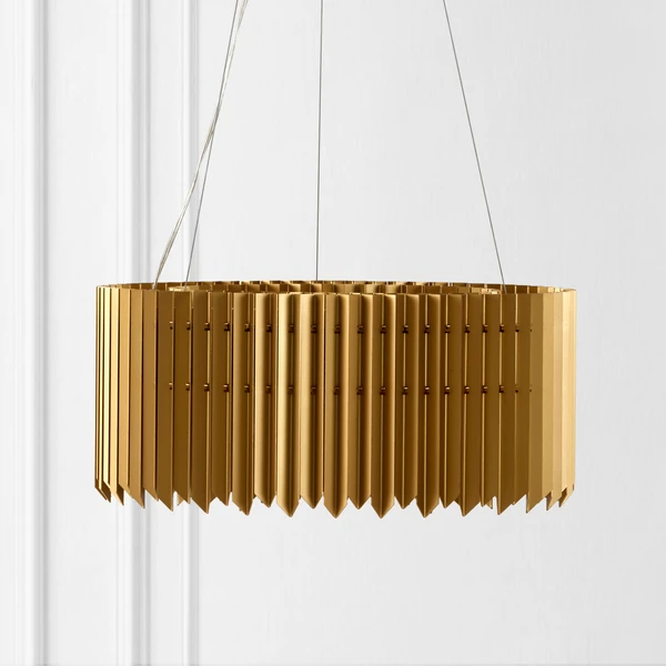 A modern and glam addition to any room, this chandelier from designer Nikki Chu boasts an accordion shade and gleaming gold finish.