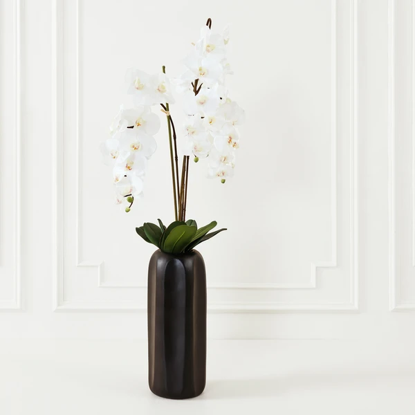 Make this faux orchid a feature of your space. Truly elegant in its black ceramic vase, this accent piece will add serenity and sophistication to any room.