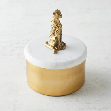 Perfect for storing jewelry and other treasures. this petite box features a brass-finished base and sleek marble lid topped with a regal cheetah.