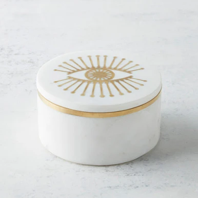 A stylish addition to any dresser, vanity, or console, this box is crafted of white marble and inlaid with a mod eye design in gold