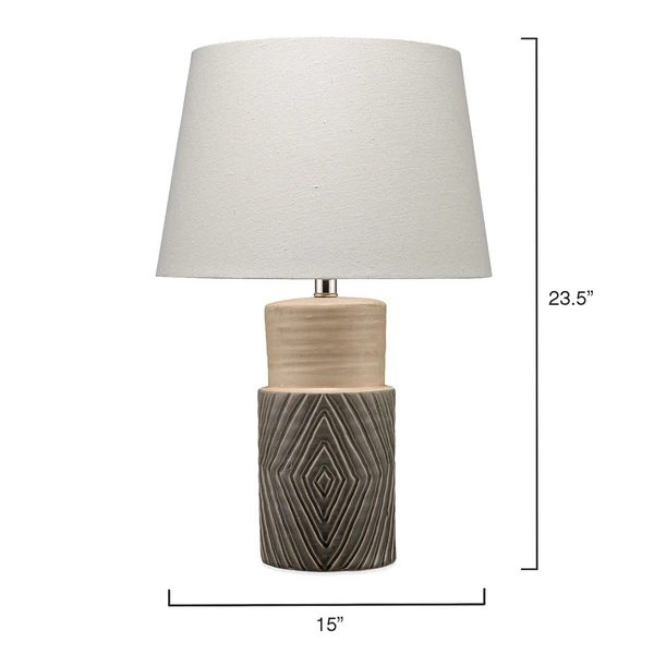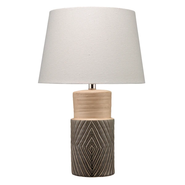The tribal design of this table lamp has a ceramic glaze and contemporary and worldly feel