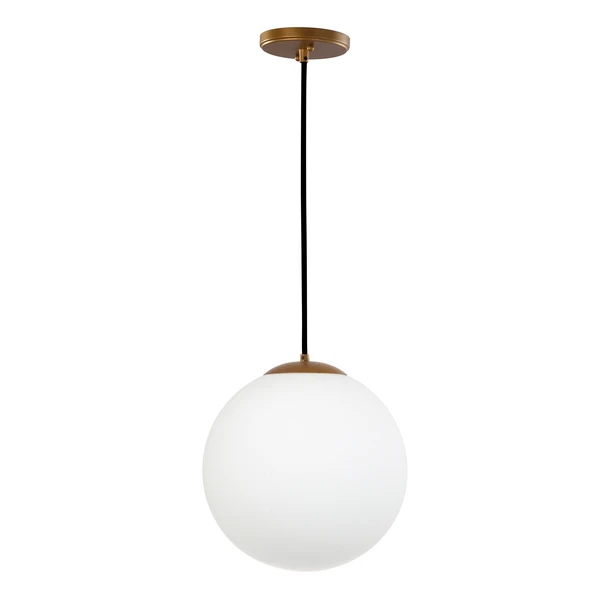 Add a touch of sleek and sophistication to your décor this contemporary pendant. Clean lines create its elegant simplicity while its antique gold finish and white glass globe bring instant character to any living room, dining room, hall or kitchen.