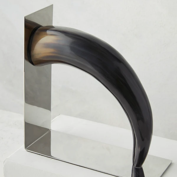 Pairing steel and horn, these bookends add a sleek and naturally luxurious accent to a desk or shelf.