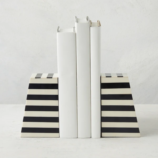 Overlaid with a mosaic design of black and white resin tiles, these trapezoidal bookends make a statement on any shelf.